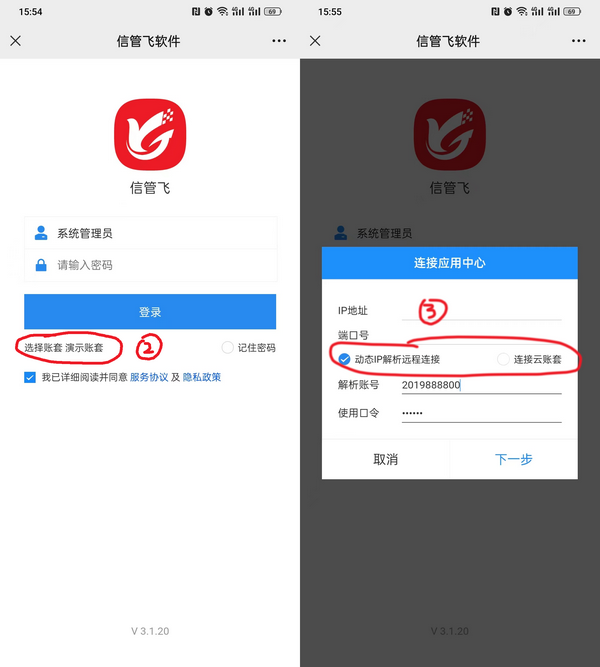 信管飛微信端登錄界面“選擇賬套”設(shè)置連接參數(shù)并選擇賬套。如果是本地版,選擇“動(dòng)態(tài)IP解析遠(yuǎn)程連接”,輸入IP解析賬號(hào)和使用口令;如果是云賬套版,選擇“連接云賬套”,輸入通行證帳號(hào)和密碼。》“使用動(dòng)態(tài)IP解析通過互聯(lián)網(wǎng)遠(yuǎn)程連接”。然后點(diǎn)擊“下一步”,選擇賬套。