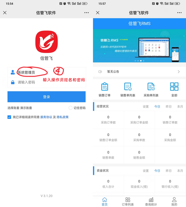 選擇完賬套后,輸入操作員姓名或編碼、密碼,然后點(diǎn)“登錄”按鈕登錄信管飛微信端。