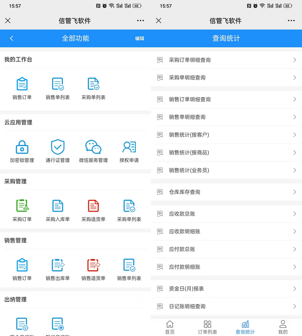 信管飛微信端主要用于查單和開單,支持各類統(tǒng)計(jì)查詢功能。