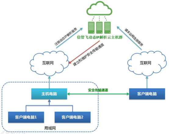 ①主機電腦向亞拓軟件云服務器發送動態IP解析服務請求。