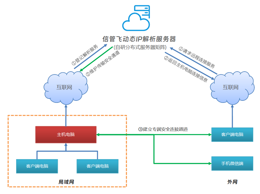 信管飛動(dòng)態(tài)IP解析服務(wù)是亞拓軟件自主研發(fā)的互聯(lián)網(wǎng)遠(yuǎn)程連接解決方案。目前通過互聯(lián)網(wǎng)遠(yuǎn)程使用軟件(如異地辦公、在家辦公)的需求越來越多,而我們一般上網(wǎng)采用的ADSL撥號(hào)上網(wǎng),每次上網(wǎng)動(dòng)態(tài)分配公網(wǎng)IP地址(而且目前絕大多數(shù)運(yùn)營商都不再 分配公網(wǎng)IP,而是通過NAT技術(shù)分配一個(gè)虛擬IP),軟件部署在公司內(nèi)部局域網(wǎng)后,由于沒有公網(wǎng)IP就無法在外部訪問。