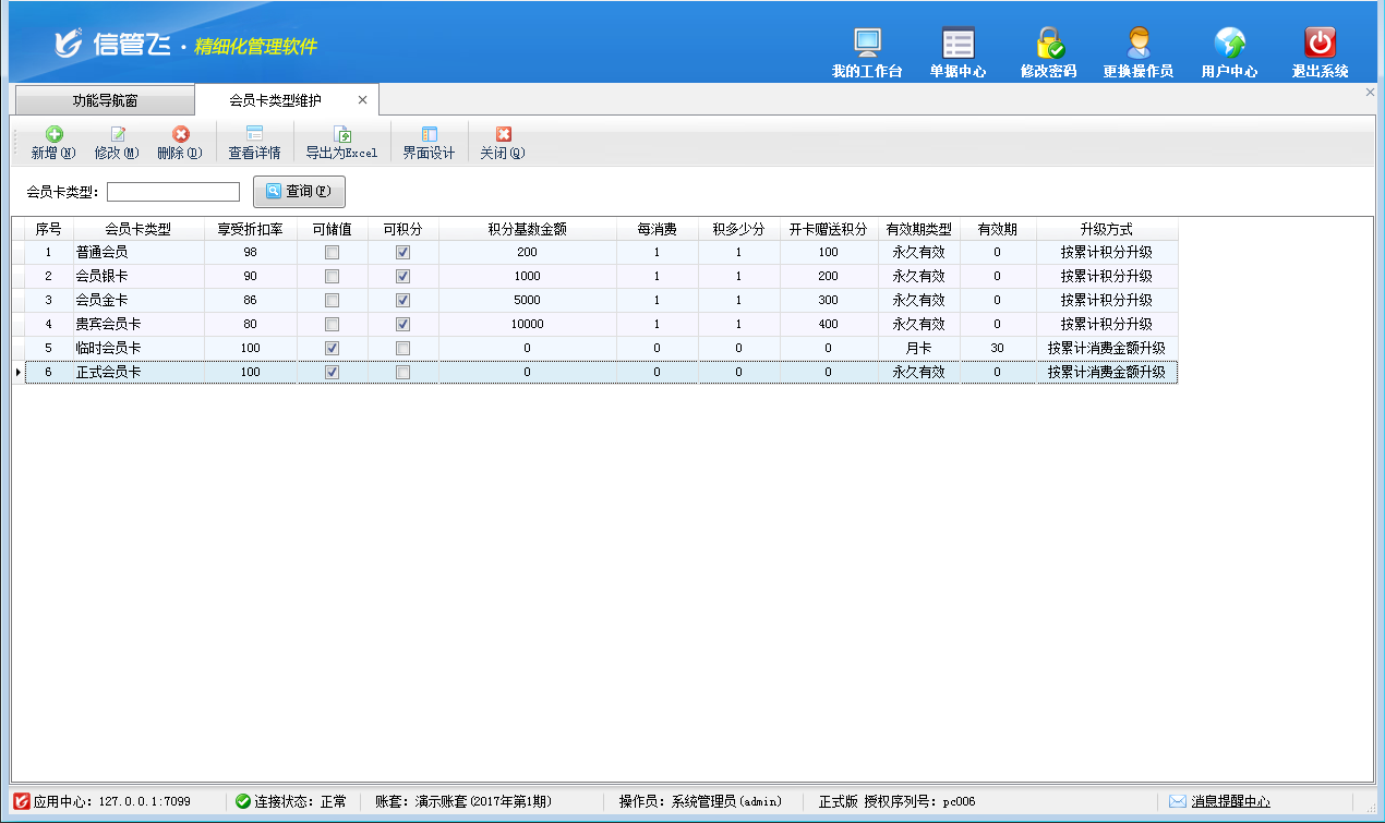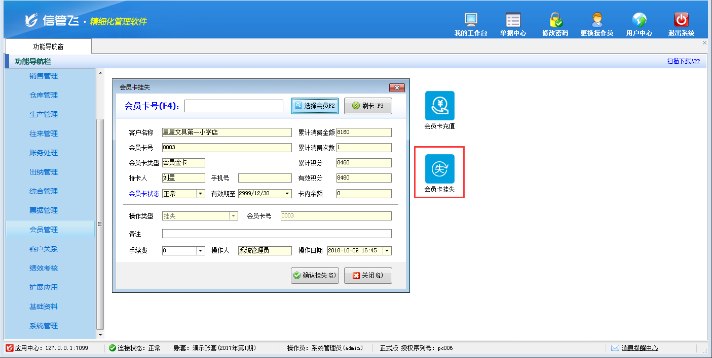 包括功能:會員卡類型維護(hù)、會員積分管理、會員儲值管理、調(diào)整會員儲值、調(diào)整會員積分、會員卡充值、積分兌換、會員卡補(bǔ)退換、會員卡掛失、會員卡禁用、會員讀卡器配置等。