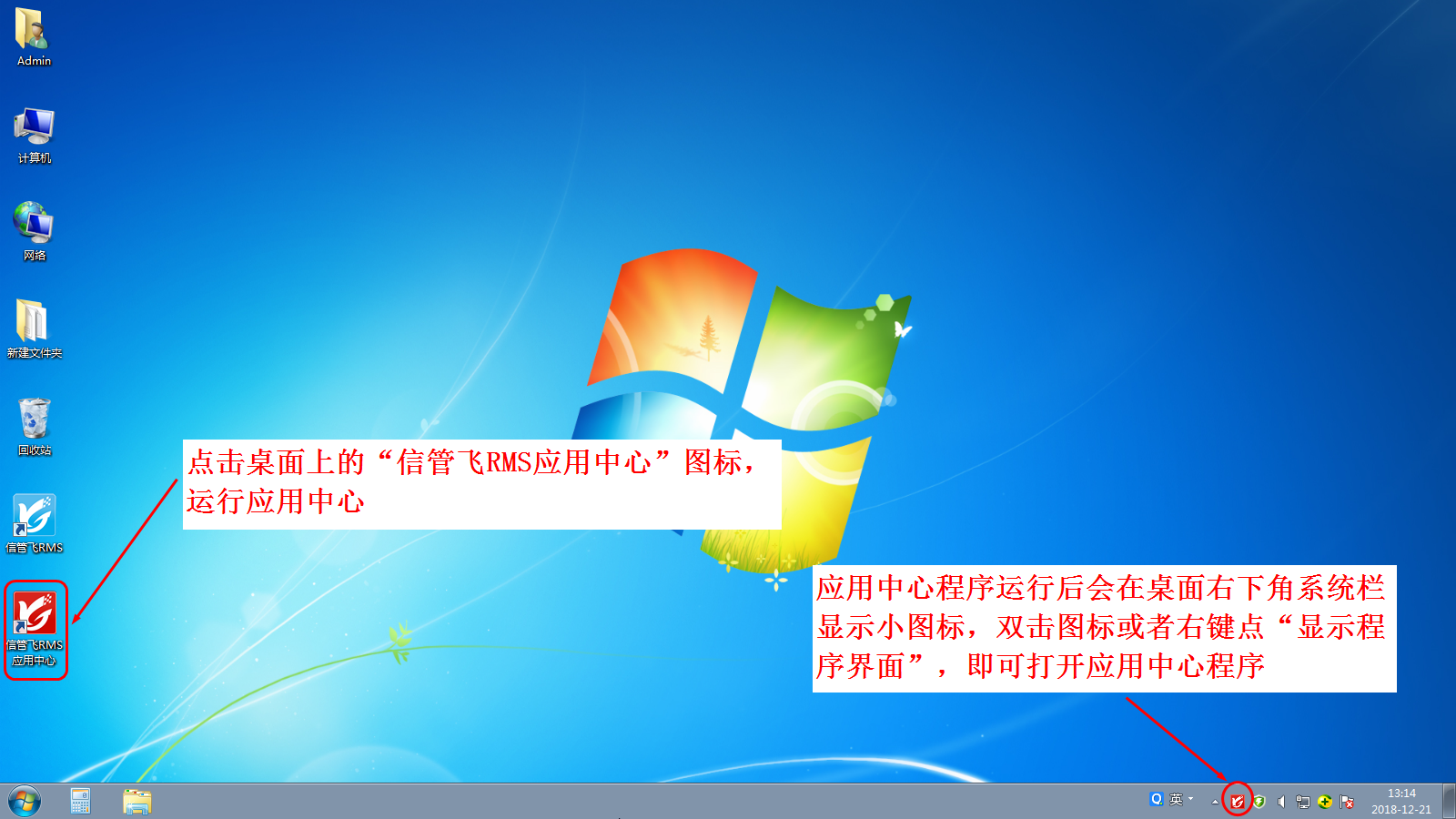 ????主機(jī)電腦開機(jī)且運(yùn)行“信管飛應(yīng)用中心”程序:點(diǎn)擊桌面上的“信管飛RMS應(yīng)用中心”程序圖標(biāo)(或者在開始菜單中點(diǎn)擊相應(yīng)功能),即可打開應(yīng)用中心程序。應(yīng)用中心程序運(yùn)行后會(huì)在桌面右下角顯示應(yīng)用中心圖標(biāo):