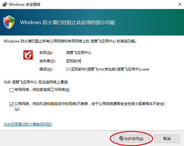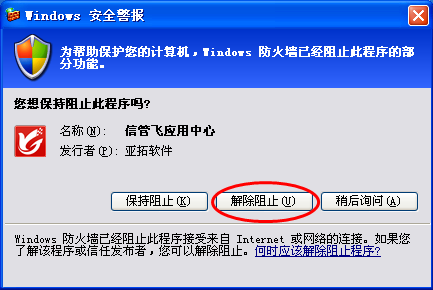 ????首次運(yùn)行應(yīng)用中心程序,如果防火墻彈出提示窗口,則Win7系統(tǒng)請(qǐng)點(diǎn)擊“允許訪問”按鈕允許訪問;WinXP系統(tǒng)請(qǐng)點(diǎn)擊“解除阻止”按鈕即可。