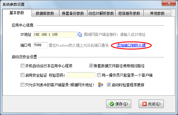 ????主機(jī)電腦的Windows防火墻或其他安全軟件的防火墻上需要開放相應(yīng)的端口,軟件支持自動(dòng)添加防火墻規(guī)則。在應(yīng)用中心程序點(diǎn)“系統(tǒng)參數(shù)”可以設(shè)置自動(dòng)添加端口到防火墻。
