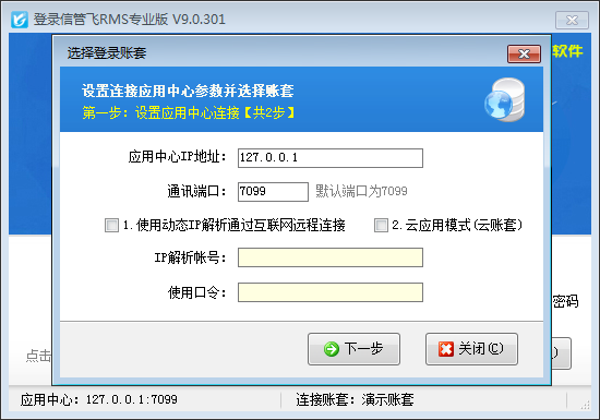 (2)互聯(lián)網(wǎng)遠程使用:如果是通過互聯(lián)網(wǎng)遠程連接(比如異地使用),軟件支持動態(tài)IP解析服務和云應用(云賬套)兩種方式(均為增值服務,需按年付費)。購買后輸入我們提供的IP解析帳號、使用口令或通行證帳號、密碼,然后點“下一步”按鈕,選擇要登錄的賬套。