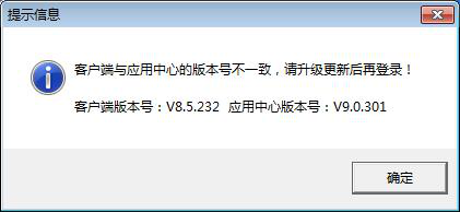 ????(4)客戶端程序登錄的時候,如果發(fā)現(xiàn)與主機電腦上的應用中心程序版本號不一致,會提示如下信息,用相同版本的安裝程序安裝一下即可。