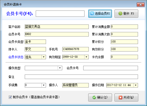 | 2 | 會員補退換卡 | 可以進行補卡、換卡、退卡操作,需連接會員卡讀卡器。 |