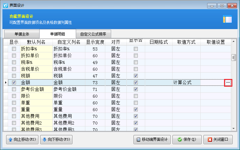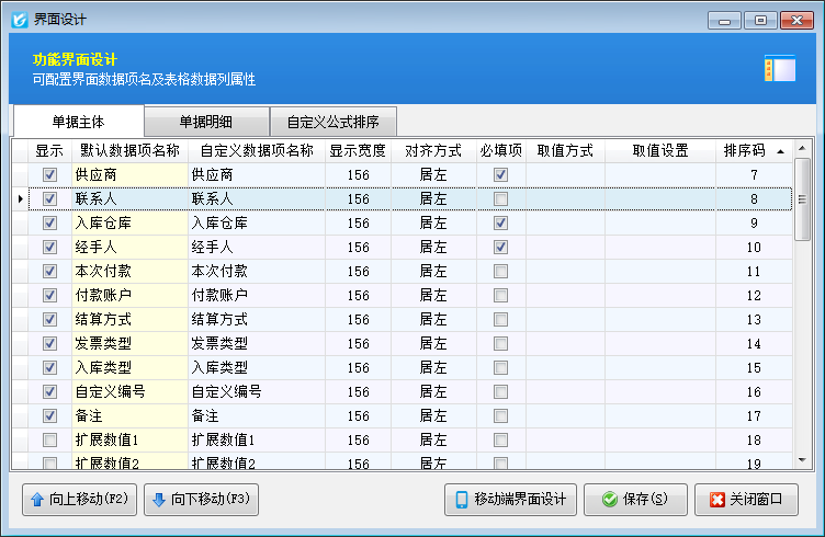 ????② 軟件支持通過界面設(shè)計配置單據(jù)的數(shù)據(jù)項(xiàng),并可調(diào)整數(shù)據(jù)項(xiàng)是否顯示、顯示順序、自定義數(shù)據(jù)項(xiàng)名稱、顯示寬度、對齊方式、是否必填、取值方式和取值設(shè)置等。