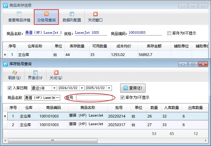 (6)查看庫存:點(diǎn)擊“查看庫存”按鈕,可查看當(dāng)前商品不同倉庫的庫存信息;若商品存在不同批號可以分批號查詢商品庫存信息。