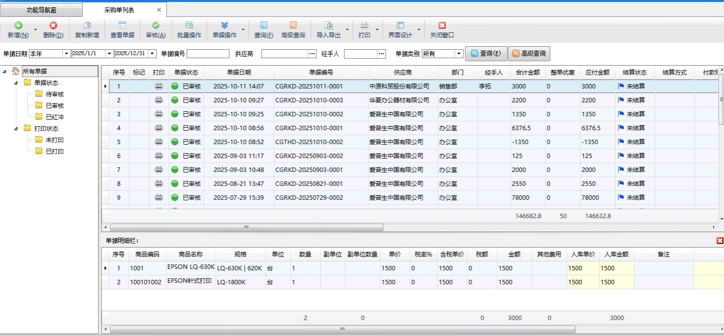 ????在功能導(dǎo)航窗點(diǎn)擊“采購管理”—》“采購單列表”即可進(jìn)入采購單列表界面,采購單列表以列表的形式顯示最近的采購入庫單/采購?fù)素泦危刹樵兂鰧δ硞€供應(yīng)商的采購情況、某個時間段內(nèi)某個商品的采購入庫單等,其界面如下圖所示。