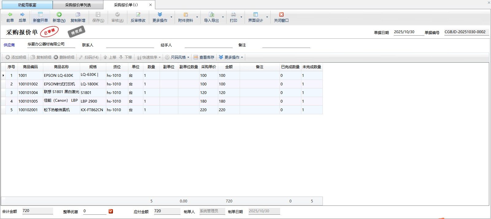 新增采購?fù)素泦危?/strong>在工具欄點(diǎn)擊“新增”—“采購?fù)素泦巍奔纯纱蜷_新增采購?fù)素泦谓缑妗?/p> 刪除:在工具欄點(diǎn)擊“刪除”按鈕可以刪除未審核的采購入庫單/采購?fù)素泦危绻麊螕?jù)已審核則不允許直接刪除。已審核的業(yè)務(wù)單據(jù)可以紅沖(在業(yè)務(wù)單據(jù)窗口點(diǎn)“更多操作”—》“紅沖”)后,然后再刪除。 復(fù)制新增單據(jù):點(diǎn)工具欄中的“復(fù)制新增”按鈕,可以復(fù)制當(dāng)前單據(jù)的數(shù)據(jù)為新單據(jù),新單據(jù)需要點(diǎn)“保存”按鈕才會實(shí)際保存到數(shù)據(jù)庫。 查看單據(jù):點(diǎn)擊工具欄中的“查看單據(jù)”按鈕可以查看當(dāng)前單據(jù)的詳細(xì)信息。 審核:點(diǎn)擊工具欄中的“審核”按鈕可以審核未審核的采購入庫單/采購?fù)素泦巍?/p> 批量操作:點(diǎn)擊“批量操作”按鈕后,進(jìn)入批量操作模式,可以打勾選擇要操作的采購入庫單/采購?fù)素泦危缓髨?zhí)行批量刪除、批量打印業(yè)務(wù)單據(jù)等操作。 查看付款情況:在工具欄“單據(jù)操作”下面點(diǎn)擊“查看付款情況”可以查看此單對應(yīng)的應(yīng)付款和付款結(jié)銷情況。 標(biāo)記備注:在工具欄“單據(jù)操作”下面點(diǎn)擊“標(biāo)記備注”可以對單據(jù)進(jìn)行備注。 標(biāo)記為已打印/未打印:在工具欄“單據(jù)操作”下面點(diǎn)擊“標(biāo)記為已打印/未打印”可以簡單標(biāo)記一下單據(jù)的打印狀態(tài)。 紅沖單據(jù):在工具欄“單據(jù)操作”下面點(diǎn)擊“紅沖單據(jù)”可以紅沖不需要的已審核的業(yè)務(wù)單據(jù)。 查詢:可以根據(jù)單據(jù)日期、單據(jù)狀態(tài)、打印狀態(tài)、單據(jù)編號、供應(yīng)商、經(jīng)手人、單據(jù)類別等條件查詢業(yè)務(wù)單據(jù)。 高級查詢:點(diǎn)“高級查詢”按鈕支持更多條件進(jìn)行業(yè)務(wù)單據(jù)查詢。 導(dǎo)入導(dǎo)出:在工具欄中點(diǎn)擊“導(dǎo)入導(dǎo)出”可以導(dǎo)入采購入庫單或采購?fù)素泦危部梢詫⒉少弳瘟斜頂?shù)據(jù)導(dǎo)出為Excel文件,也可以導(dǎo)出稅控開票數(shù)據(jù)XML。 打印:點(diǎn)“打印”—》“打印采購單”可以快速打印采購單;點(diǎn)“批量打印采購單”可以批量打印采購單(需啟用批量操作模式);點(diǎn)“采購單打印格式設(shè)計”可以設(shè)置打印格式,有關(guān)打印格式模板設(shè)計的詳細(xì)操作說明參見打印格式模板設(shè)計專門手冊。 界面設(shè)計:點(diǎn)“界面設(shè)計”可配置界面數(shù)據(jù)項(xiàng)名及表格數(shù)據(jù)列屬性;點(diǎn)“界面設(shè)計”—》“移動端界面設(shè)計”可以配置移動端界面顯示的數(shù)據(jù)項(xiàng);點(diǎn)“客戶平臺訂單列表”可以配置外部客戶端界面顯示的數(shù)據(jù)項(xiàng),外部客戶界面設(shè)計默認(rèn)顯示移動端的顯示設(shè)計。點(diǎn)擊進(jìn)入界面設(shè)計界面,可進(jìn)行導(dǎo)入導(dǎo)出配置數(shù)據(jù)(文本文件)操作:“導(dǎo)入配置數(shù)據(jù)”可以導(dǎo)入其他單據(jù)的配置數(shù)據(jù);“導(dǎo)出配置數(shù)據(jù)”可以導(dǎo)出單據(jù)的配置數(shù)據(jù);“導(dǎo)出配置(文本文件)”可以導(dǎo)出單據(jù)的配置文本文件(注:只有系統(tǒng)管理員賬號可以導(dǎo)入導(dǎo)出配置數(shù)據(jù)文件)。 ????采購報價單用于管理采購詢價信息,相對于采購訂單,報價單的采購意向更弱。在采購訂單和采購入庫單中可以調(diào)取引用采購報價單。 ????在功能導(dǎo)航窗點(diǎn)“采購管理”—》“采購報價單”即可進(jìn)入“采購報價單列表”界面,如下圖所示: 新增采購報價單:在工具欄點(diǎn)擊“新增”,即可打開新增采購報價單界面。 刪除:在工具欄點(diǎn)擊“刪除”按鈕可以刪除未審核的采購報價單,如果單據(jù)已審核則不允許直接刪除。已審核的業(yè)務(wù)單據(jù)可以紅沖(在業(yè)務(wù)單據(jù)窗口點(diǎn)“更多操作”—》“紅沖單據(jù)”)后,然后再刪除。 復(fù)制新增單據(jù):點(diǎn)工具欄中的“復(fù)制新增”按鈕,可以復(fù)制當(dāng)前單據(jù)的數(shù)據(jù)為新單據(jù),新單據(jù)需要點(diǎn)“保存”按鈕才會實(shí)際保存到數(shù)據(jù)庫。 查看單據(jù):點(diǎn)擊工具欄中的“查看單據(jù)”按鈕可以查看當(dāng)前單據(jù)的詳細(xì)信息。 批量操作:點(diǎn)擊“批量操作”按鈕后,進(jìn)入批量操作模式,可以打勾選擇要操作的采購報價單,然后執(zhí)行批量刪除、批量打印業(yè)務(wù)單據(jù)等操作。 更多操作:報價單支持生成采購訂單或者直接生成采購入庫單、支持報價單標(biāo)記備注、查看附件資料。 查詢:可以根據(jù)單據(jù)日期、打印狀態(tài)、供應(yīng)商、商品名稱等條件查詢業(yè)務(wù)單據(jù)。 導(dǎo)出:在工具欄中點(diǎn)擊“導(dǎo)出為EXCEL”可以將采購報價單列表數(shù)據(jù)導(dǎo)出為Excel文件。 打印:點(diǎn)“打印”—》“打印”可以快速打印報價單列表;點(diǎn)“打印預(yù)覽”可以預(yù)覽打印采購報價單效果;點(diǎn)“打印格式設(shè)計”可以設(shè)置打印格式,有關(guān)打印格式模板設(shè)計的詳細(xì)操作說明參見打印格式模板設(shè)計專門手冊。 界面
