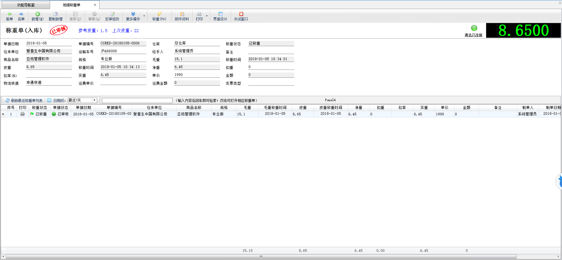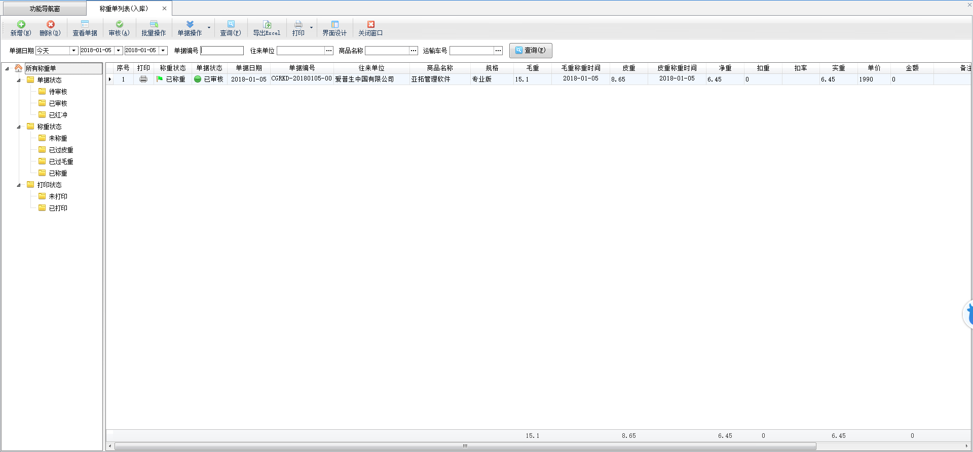 查看單據(jù):點(diǎn)擊工具欄中的“查看單據(jù)”按鈕可以查看當(dāng)前單據(jù)的詳細(xì)信息。 批量操作:點(diǎn)擊“批量操作”按鈕后,進(jìn)入批量操作模式,可以打勾選擇要操作的稱重入庫單,然后執(zhí)行批量刪除、批量打印業(yè)務(wù)單據(jù)等操作。 標(biāo)記為已打印/未打印:在工具欄“單據(jù)操作”下面點(diǎn)擊“標(biāo)記為已打印/未打印”可以簡單標(biāo)記一下單據(jù)的打印狀態(tài)。 紅沖單據(jù):在工具欄“單據(jù)操作”下面點(diǎn)擊“紅沖單據(jù)”可以紅沖不需要的已審核的業(yè)務(wù)單據(jù)。 查詢:可以根據(jù)單據(jù)日期、單據(jù)狀態(tài)、稱重狀態(tài)、打印狀態(tài)、單據(jù)編號、往來單位、商品名稱、運(yùn)輸車號等條件查詢業(yè)務(wù)單據(jù)。 導(dǎo)出為 EXCEL:在工具欄中點(diǎn)擊“導(dǎo)出為 EXCEL”可以將采購單列表數(shù)據(jù)導(dǎo)出為 Excel 文件。