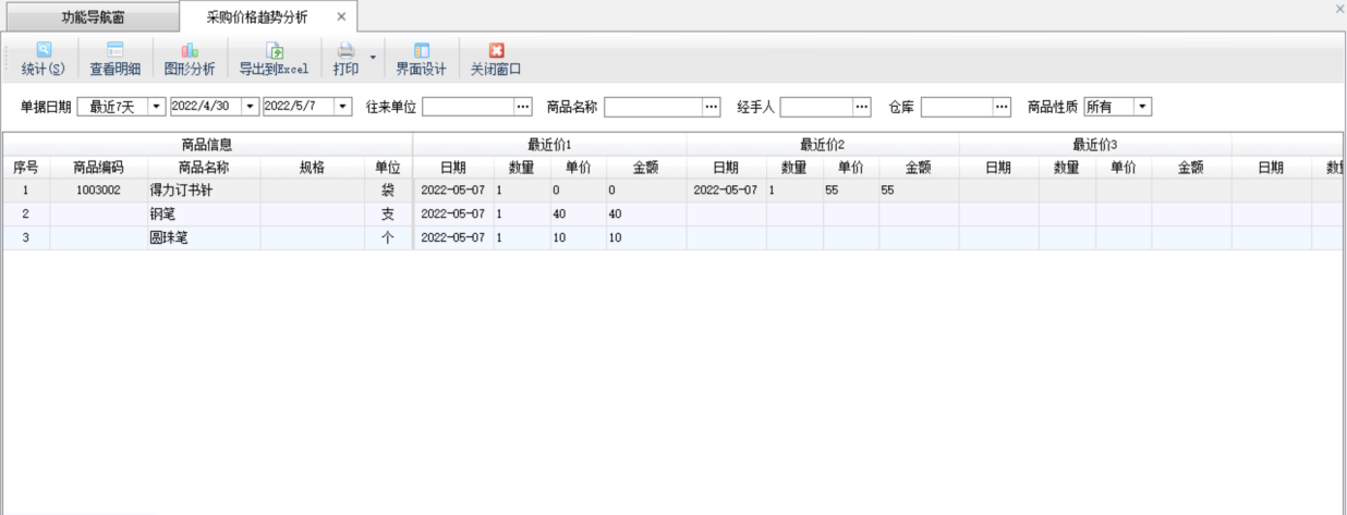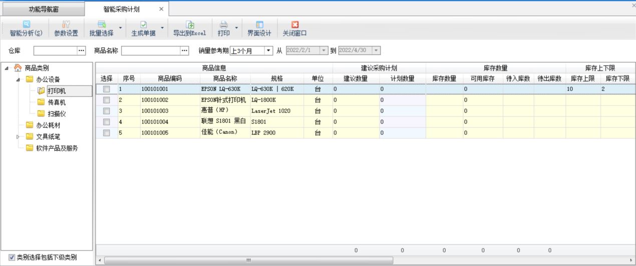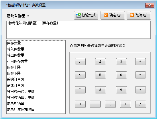 打印:點(diǎn)“打印”—》“打印稱重單”可以快速打印稱重入庫單;點(diǎn)“批量打印稱重單”可以批量打印稱重單(需啟用批量操作模式);點(diǎn)“稱重單打印格式設(shè)計”可以設(shè)置打印格式,有關(guān)打印格式模板設(shè)計的詳細(xì)操作說明參見打印格式模板設(shè)計專門手冊。 界面設(shè)計:軟件支持通過界面設(shè)計配置列表顯示的數(shù)據(jù)項(xiàng),并可調(diào)整數(shù)據(jù)項(xiàng)是否顯示、顯示順序、自定義數(shù)據(jù)項(xiàng)名稱、顯示寬度、對齊方式、是否必填等。 ????智能采購計劃可根據(jù)當(dāng)前庫存情況,并可結(jié)合庫存上下限、同期銷售量、銷售訂單數(shù)量、待審核數(shù)量等條件進(jìn)行組合運(yùn)算,從而給出建議的商品采購量。可以把建議結(jié)果生成為采購訂單。 ????在功能導(dǎo)航窗點(diǎn)“采購管理”—》“智能采購計劃”即可進(jìn)入本功能,如下圖所示: ????以下為“智能采購計劃”的功能操作說明: (1)參數(shù)設(shè)置:可以設(shè)置“建議采購量”的運(yùn)算公式,軟件將根據(jù)您設(shè)計的公式計算出建議數(shù)量。 ????雙擊“數(shù)據(jù)項(xiàng)列表”中的相應(yīng)數(shù)據(jù)項(xiàng),會插入數(shù)據(jù)項(xiàng)到公式文本框中,點(diǎn)擊數(shù)字按鈕和加減乘除按鈕,可以插入符號到公式文本框中。 ????設(shè)置完公式后,請先點(diǎn)“校驗(yàn)公式”按鈕,校驗(yàn)公式是否合法有效,如果提示公式錯誤,請重新設(shè)置后再點(diǎn)“確定”按鈕保存。 (2)智能分析:點(diǎn)“智能分析”按鈕,軟件會根據(jù)參數(shù)設(shè)置中設(shè)置的采購量運(yùn)算公式計算出商品的“建議數(shù)量”,默認(rèn)“計劃數(shù)量”(即后續(xù)生成訂單的數(shù)量)等于“建議數(shù)量”,您可根據(jù)業(yè)務(wù)情況,再手工調(diào)整“計劃數(shù)量”。 (3)批量選擇:點(diǎn)“批量選擇”按鈕,可以對列表信息進(jìn)行全選,反選,全不選操作。 (4)生成單據(jù):點(diǎn)“生成單據(jù)”按鈕,軟件會將列表中“計劃數(shù)量”不為空的記錄生成為采購訂單。 單據(jù)中心:可根據(jù)單據(jù)日期、單據(jù)編號、單據(jù)類別、往來單位、商品、審核狀態(tài)等各種條件查詢業(yè)務(wù)單據(jù)記錄。 采購訂單查詢:可根據(jù)訂單日期、訂單編號、往來單位、商品名稱、執(zhí)行狀態(tài)、審核狀態(tài)等各種條件查詢相應(yīng)的采購訂單記錄。 采購訂單明細(xì)查詢:可根據(jù)各類條件查詢采購訂單明細(xì)記錄,包括訂單信息和訂單包括的明細(xì)信息(商品、價格等信息)。點(diǎn)“高級查詢”按鈕可使用更多查詢條件查詢。點(diǎn)“界面設(shè)計”可以配置顯示的數(shù)據(jù)列。 采購訂單統(tǒng)計:可以從商品、經(jīng)手人、往來單位三種角度匯總采購訂貨情況、已發(fā)貨情況、未發(fā)貨情況和中止情況。點(diǎn)“統(tǒng)計方式”可以選擇具體的統(tǒng)計方式,默認(rèn)會按照商品進(jìn)行統(tǒng)計。 采購訂單執(zhí)行情況:可以統(tǒng)計出每個采購訂單執(zhí)行情況,包括合計金額、已完成金額、未完成金額以及中止金額等信息。 采購訂單交貨提醒:可根據(jù)交貨日期查看采購訂單商品的交貨狀態(tài)。 采購單匯總表:可根據(jù)單據(jù)日期、往來單位、商品、經(jīng)手人、倉庫等條件,查詢采購單記錄。采購單匯總表中可以分開統(tǒng)計采購入庫單和采購?fù)素泦巍?/p> 采購單明細(xì)查詢:可根據(jù)單據(jù)日期、往來單位、商品、經(jīng)手人、倉庫等條件,查詢采購單明細(xì)記錄(即采購商品明細(xì)記錄)。 采購報價單查詢:可根據(jù)單據(jù)日期、單據(jù)編號、往來單位、商品、經(jīng)手人等條件,查詢采購報價單記錄。 采購報價單明細(xì)查詢:可根據(jù)單據(jù)日期、單據(jù)編號、往來單位、商品、經(jīng)手人等條件,查詢采購報價單明細(xì)記錄(即報價商品明細(xì)記錄)。 稱重入庫單查詢:可根據(jù)單據(jù)日期、單據(jù)編號、往來單位、稱重狀態(tài)、商品名稱、經(jīng)手人、倉庫、運(yùn)輸車號等條件,查詢稱重入庫單記錄。 費(fèi)用入庫單查詢:可根據(jù)單據(jù)日期、單據(jù)編號、往來單位、商品名稱、經(jīng)手人、倉庫、單據(jù)狀態(tài)等條件,查詢費(fèi)用入庫單記錄。 采購統(tǒng)計(按供應(yīng)商):可以匯總某個時間段內(nèi),從每個供應(yīng)商處采購的商品匯總數(shù)量、采購均價、金額、稅額以及優(yōu)惠情況。統(tǒng)計時支持按商品、按倉庫、按經(jīng)手人等條件進(jìn)行統(tǒng)計。 采購統(tǒng)計(按商品):可以匯總某個時間段內(nèi),每種商品的采購數(shù)量、采購均價、金額、稅額以及贈品數(shù)量、贈品金額。統(tǒng)計時支持按往來單位(供應(yīng)商)、按倉庫、按經(jīng)手人等條件進(jìn)行統(tǒng)計。 采購統(tǒng)計(按經(jīng)手人):可以匯總某個時間段內(nèi),每個經(jīng)手人的采購數(shù)量、采購均價、金額、稅額以及贈品數(shù)量、贈品金額。 采購年度匯總(按商品):可以匯總某一年內(nèi),每種商品每個月里的采購數(shù)量和金額。統(tǒng)計時支持按供應(yīng)商進(jìn)行統(tǒng)計。 采購年度匯總(按供應(yīng)商):可以匯總某一年內(nèi),每個供應(yīng)