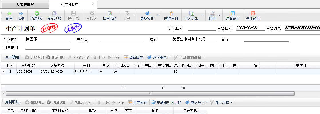 單據(jù)明細:錄入本次計劃生產(chǎn)的商品數(shù)量、計劃開工日期和完工日期等信息。其他數(shù)量不需要錄入,后續(xù)通過引用單據(jù)的方式,實現(xiàn)執(zhí)行數(shù)量和生產(chǎn)計劃單執(zhí)行狀態(tài)跟蹤。