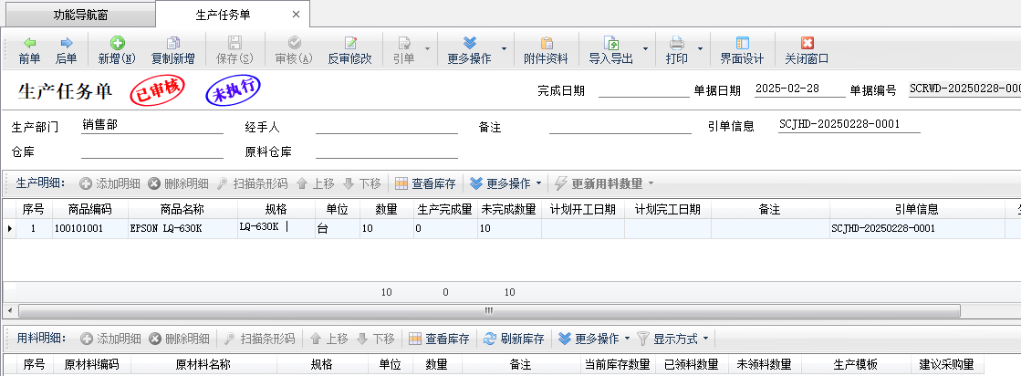 引單:生產(chǎn)任務單可以引用“銷售訂單”或“生成計劃單”,在有制定生產(chǎn)計劃單的情況下,建議引用“生產(chǎn)計劃單”,這樣軟件可更新計劃單的“下達任務數(shù)量”。沒有引用關系的話,軟件不會直接根據(jù)商品名稱等更新計劃單的執(zhí)行數(shù)量。