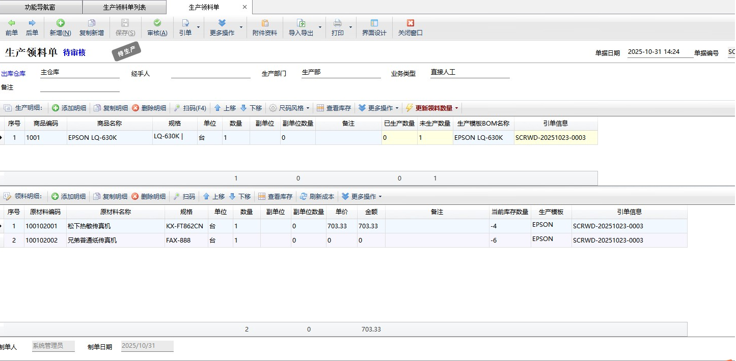 引單:生產(chǎn)領料出庫單可以引用“生產(chǎn)任務單”或“委外任務單”,并將任務單中的產(chǎn)品明細作為單據(jù)的生產(chǎn)明細,同時如果相應的商品有生產(chǎn)模板則自動根據(jù)生產(chǎn)模板生成領料明細。