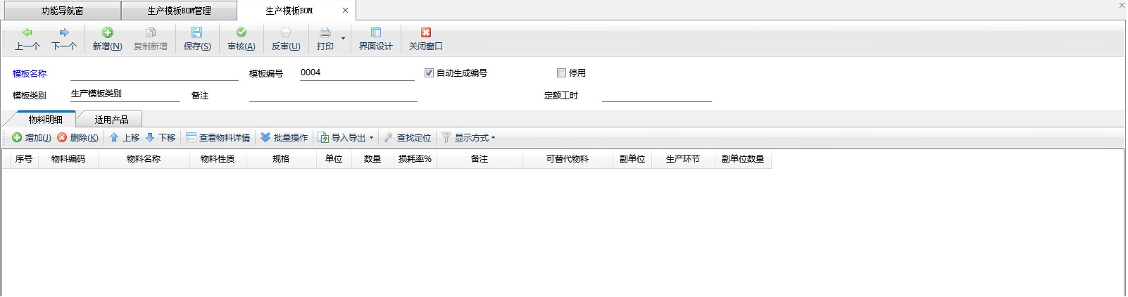 批量復制:可以根據(jù)當前選擇的生產(chǎn)模板批量生成。一般用于多個產(chǎn)品的物料清單相同或相近時,可以批量復制,再進行手工調(diào)整。