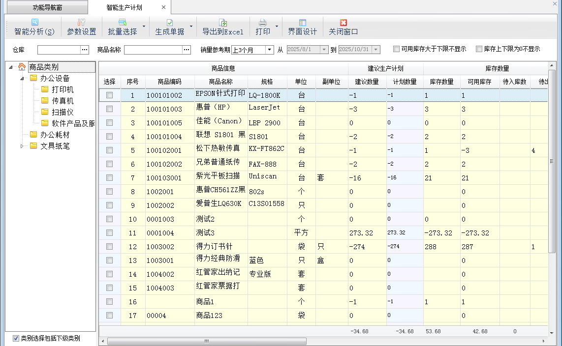 ????智能生產(chǎn)計劃可根據(jù)當前庫存情況,并可結(jié)合庫存上下限、往年同期銷售量、銷售訂單數(shù)量、待審核數(shù)量等條件進行組合運算,從而給出建議的商品生產(chǎn)建議數(shù)量,并可以把建議結(jié)果生成為生產(chǎn)計劃單。