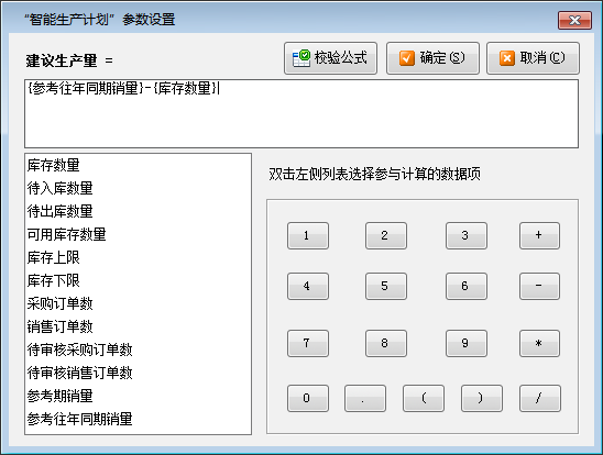 (1)參數(shù)設置:可以設置“建議生產(chǎn)量”的運算公式,軟件將根據(jù)您設計的公式計算出建議數(shù)量。