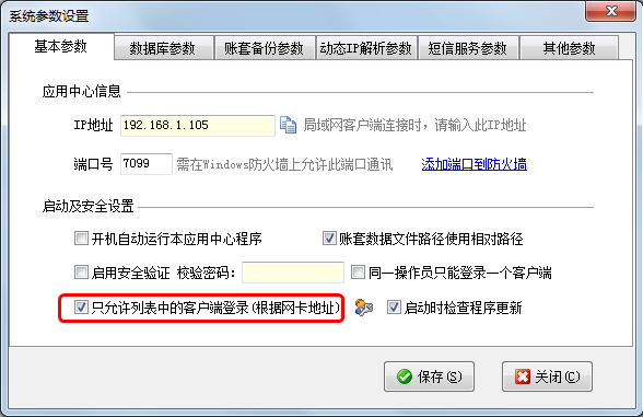 ????點(diǎn)“設(shè)置可連接客戶端”按鈕,可以設(shè)置允許哪些客戶端電腦登錄。使用這個(gè)功能需要先在“系統(tǒng)參數(shù)設(shè)置”中復(fù)選“只允許列表中的客戶端登錄”。