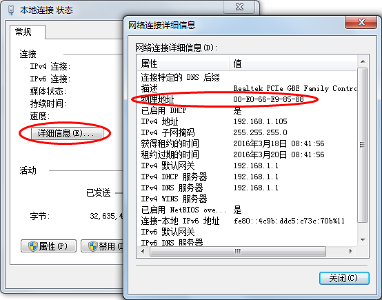 ????設(shè)置允許連接的客戶端網(wǎng)卡地址,每行一個(gè)網(wǎng)卡地址。客戶端的網(wǎng)卡地址可以在連接客戶端界面中點(diǎn)“復(fù)制客戶端網(wǎng)卡地址”進(jìn)行復(fù)制,也可以在“網(wǎng)絡(luò)和共享中心”中 “本地連接狀態(tài)”的詳細(xì)信息查看到。