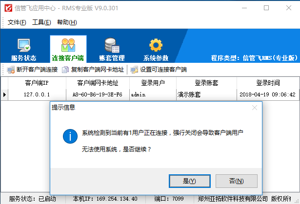 ????點(diǎn)“斷開(kāi)客戶端連接”按鈕,可以斷開(kāi)選擇的客戶端連接,對(duì)應(yīng)的客戶端自動(dòng)下線,無(wú)法使用軟件。