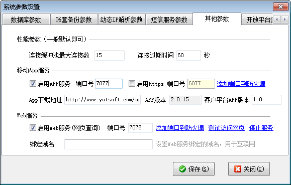 ????Web 服務用于網頁查詢,如微信業務通知中可以直接查看單據詳情,此外微信支付等業務也依賴 Web 服務接收支付通知。在系統參數設置中可以維護 Web 服務的端口號以及綁定的域名。