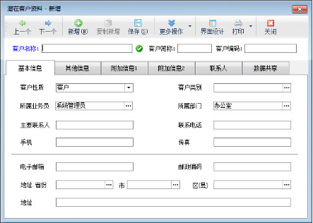 ????新增潛在客戶:點工具欄中的“新增”按鈕,可以增加新的潛在客戶資料。新增加客戶資料如下圖2所示。