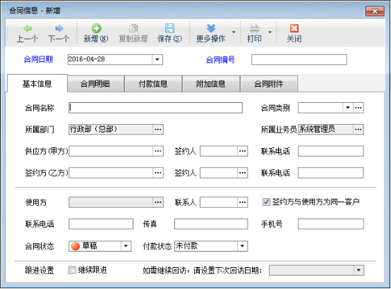 ????合同信息包括基本信息、合同明細(即采購或銷售的商品明細、服務明細等)、合同款項、付款分期信息、附加信息以及合同附件。其中合同日期、合同編號、合同名稱、簽約方客戶為必填數據項。