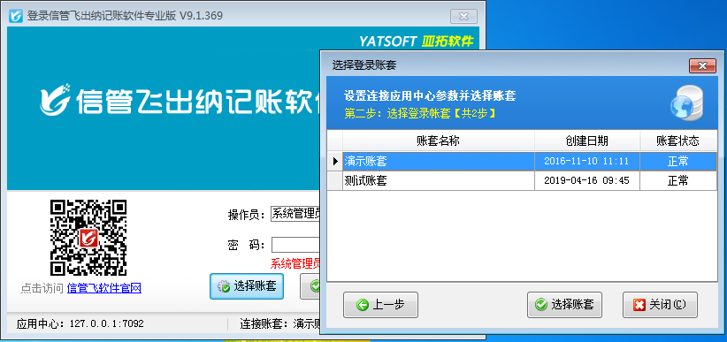????從新打開應用中心后,電腦右下角會顯示應用中心圖標。然后打開客戶端程序(藍色圖標),登錄界面點擊“選擇帳套”,然后下一步,然后會出現選擇登錄帳套窗口,此時顯示的可登錄的帳套列表。剛才已停用的“信管飛帳套”已不在列表內,無法選擇到了,如圖所示。