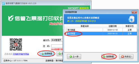 ????運行信管飛票據打印軟件客戶端(藍色圖標),在軟件登錄界面點擊“選擇賬套”,在“選擇登錄賬套”界面選擇我們所需要的賬套,然后登錄軟件即可。