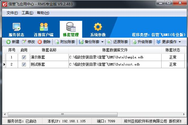 ????亞拓軟件旗下的信管飛RMS、信管飛倉庫管理軟件、信管飛送貨單軟件、信管飛出納記賬軟件、信管飛票據打印軟件等新架構程序軟件安裝后會顯示兩個圖標,一個是應用中心程序(紅色圖標),一個是客戶端程序(藍色圖標)。這些軟件都含有賬套管理功能,在應用中心里面可以建立多個賬套,已使用的帳套如果不再繼續使用,可以停用帳套,停用帳套后,客戶端程序登錄時無法連接該帳套。我們以信管飛RMS為例演示一下如何停用帳套。