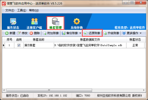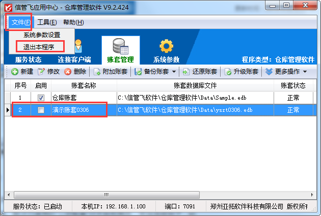 ????亞拓軟件旗下的信管飛RMS、信管飛倉庫管理軟件、信管飛送貨單軟件、信管飛出納記賬軟件、信管飛票據打印軟件等軟件程序安裝后會顯示兩個圖標,一個是應用中心程序(紅色圖標),一個是客戶端程序(藍色圖標)。這些軟件都含有賬套管理功能,在應用中心里面可以建立多個賬套,已使用的帳套如果不再繼續使用,可以停用帳套,停用帳套后,客戶端程序登錄時無法連接該帳套。我們以信管飛送貨單軟件為例演示一下如何停用帳套。