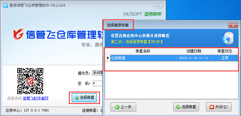 ????運行信管飛倉庫管理軟件客戶端(藍色圖標),在軟件登錄界面點擊“選擇賬套”,在“選擇登錄賬套”界面選擇我們所需要的賬套,然后登錄軟件即可。