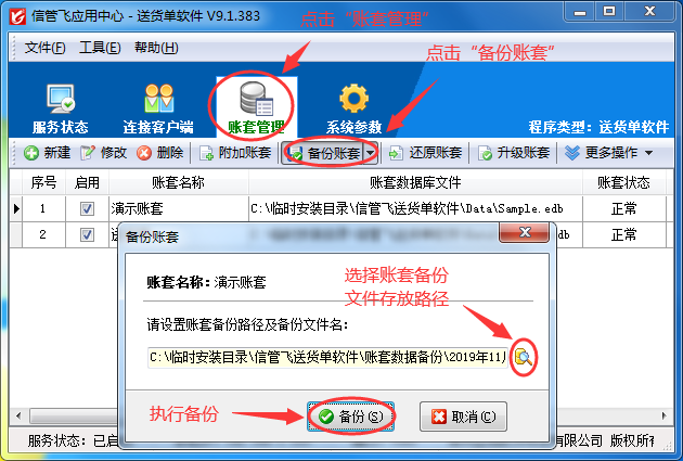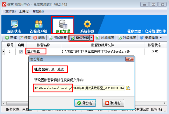 ????一、在信管飛倉庫管理軟件應用中心程序中執行賬套備份。