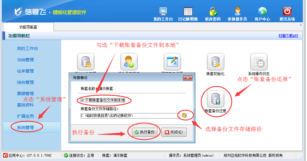 ????②如果需要將賬套備份文件同時存儲在客戶端電腦上時,需要打勾選中“下載賬套文件到本地”,然后選擇賬套備份文件需要存儲的文件路徑,點擊“執行備份”按鈕即可將賬套備份在客戶端所在的電腦上存儲。