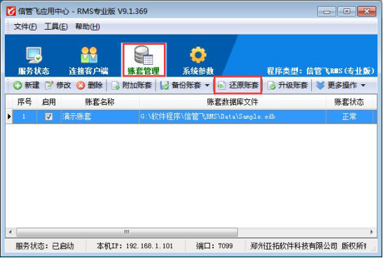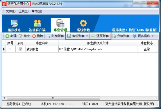 ????打開信管飛RMS應用中心(桌面右下角紅色的圖標)—》“賬套管理”即可進入賬套管理界面,如下圖所示: