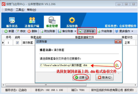 ????二、在信管飛倉庫管理軟件客戶端程序中執行賬套備份