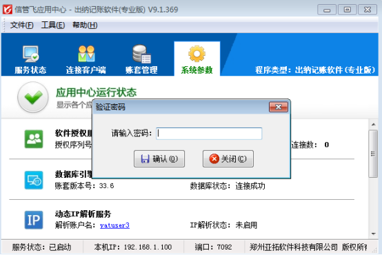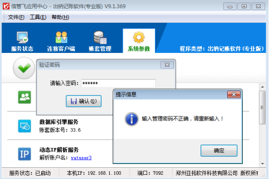 ????動態IP解析服務是亞拓軟件開發的基于互聯網的遠程連接解決方案,采用專屬安全技術,可以支持網絡版本在異地連接主機電腦進行共享數據使用。動態IP解析服務屬于增值服務,使用需要另外進行購買,購買后會分配解析賬號、管理密碼和使用口令信息,管理密碼和使用口令可以自己修改。下面我們以信管飛RMS為例介紹一下如何修改動態IP解析服務的管理密碼及使用口令。