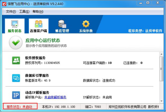 ????信管飛RMS、信管飛倉庫管理軟件、信管飛出納記賬軟件、信管飛送貨單軟件和信管飛票據打印軟件都由客戶端程序和應用中心程序兩部分組成,應用中心可以全面掌控軟件的運行情況,可以隨時查看各類服務的運行狀態,主要包括軟件授權服務情況、數據庫引擎服務情況、動態IP解析服務情況、手機短信服務情況等。下面我們以信管飛RMS專業版為例介紹一下應用中心的服務狀態。