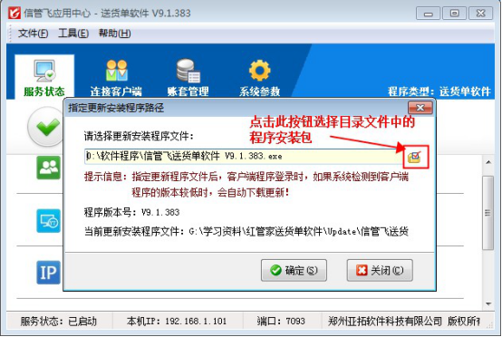 ????信管飛送貨單軟件、信管飛RMS軟件、信管飛倉庫管理軟件等都支持網絡版本(即可以多臺機器同時使用,數據共享,數據集中存儲在一臺機器上),軟件會不定期更新新版本,網絡版多臺電腦使用的時候,每次更新程序需要每臺電腦都下載最新版安裝程序進行安裝,非常麻煩。軟件支持在主機電腦的應用中心程序上指定更新安裝程序,便于客戶端登錄的時候如版本不一致會提示直接下載安裝程序。