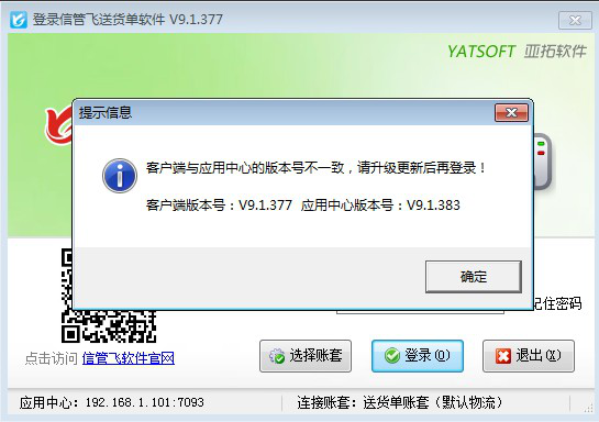 ????點擊“確定”指定更新程序后,點擊客戶端電腦登錄軟件,登錄時會提示“客戶端與應用中心版本號不一致,請升級更新后再登錄”,我們點擊“確定”按鈕,如下圖所示: