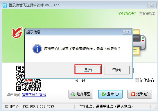 ????點擊確定按鈕后會提示“應用中心已設置了更新安裝程序,是否下載更新”,點擊“是”即可,會自動下載和應用中心版本一致的程序,如下圖所示: