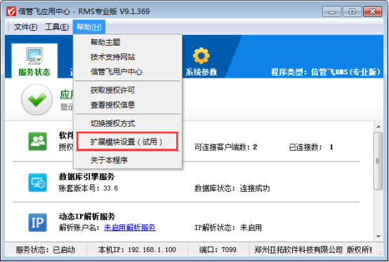 ????首先運行信管飛RMS軟件應用中心,打開信管飛RMS軟件應用中心主界面,點擊“幫助”—》“擴展模塊設置(試用)”,打開擴展模塊設置(試用)界面,如下圖所示。