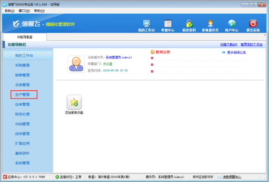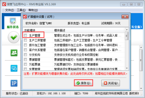 ????在擴展模塊設置(試用)界面選擇需要試用的擴展功能模塊(如生產管理模塊)并保存設置(需要注意的是擴展功能模塊是屬于增值收費功能模塊,此處啟用相應功能模塊是僅供試用,試用期限為30天,如果需要長期使用相應功能模塊請購買),然后重新登錄軟件即可試用擴展功能模塊。