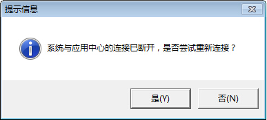 ????第一種解決方式:鼠標雙擊軟件界面最下方的“連接狀態:已斷開”字樣,系統會彈出“系統與應用中心的連接已斷開,是否嘗試重新連接?”提示信息,如圖所示,點“是”按鈕,客戶端程序會嘗試重新建立與應用中心程序的連接。如果連接成功即可打開相應的功能,繼續使用軟件。