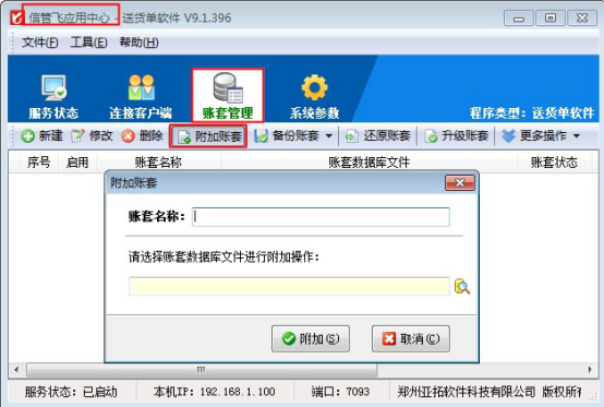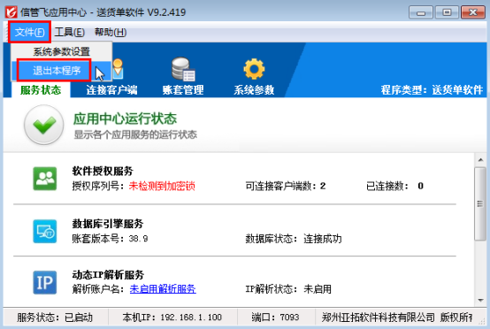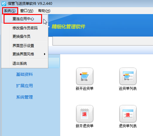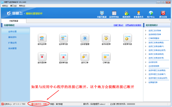 ????信管飛RMS、信管飛倉庫管理軟件、信管飛票據(jù)打印軟件、信管飛出納記賬軟件、信管飛送貨單軟件都包括客戶端程序和應(yīng)用中心程序兩個(gè)模塊,客戶端程序登錄系統(tǒng)時(shí),應(yīng)用中心程序是必須打開的。如果主機(jī)電腦關(guān)機(jī)或關(guān)閉應(yīng)用中心程序、程序出現(xiàn)異常等,客戶端程序與應(yīng)用中心的連接就會(huì)斷開。應(yīng)用中心程序再次正常運(yùn)行后,客戶端程序需要重新建立與應(yīng)用中心程序的連接。下面我們以信管飛送貨單軟件為例介紹一下客戶端程序重連應(yīng)用中心程序的操作方法。