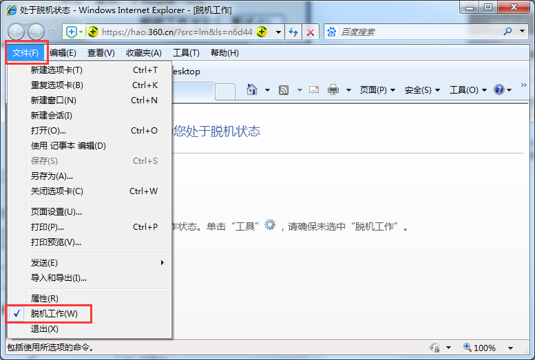 ????打開IE瀏覽器,在瀏覽器菜單欄點(diǎn)擊“文件”,然后在文件下拉列表中,可以看到“脫機(jī)工作”選項(xiàng)前面有一個(gè)“√”,說明當(dāng)前是已開啟脫機(jī)工作模式,在此點(diǎn)擊將“脫機(jī)工作”取消即可。