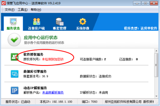 ????一、打開軟件應(yīng)用中心程序(紅色圖標(biāo)),可先查看服務(wù)狀態(tài)下的“軟件授權(quán)服務(wù)”,如果授權(quán)序列號(hào)顯示“未檢測(cè)到加密鎖”,如下圖所示: